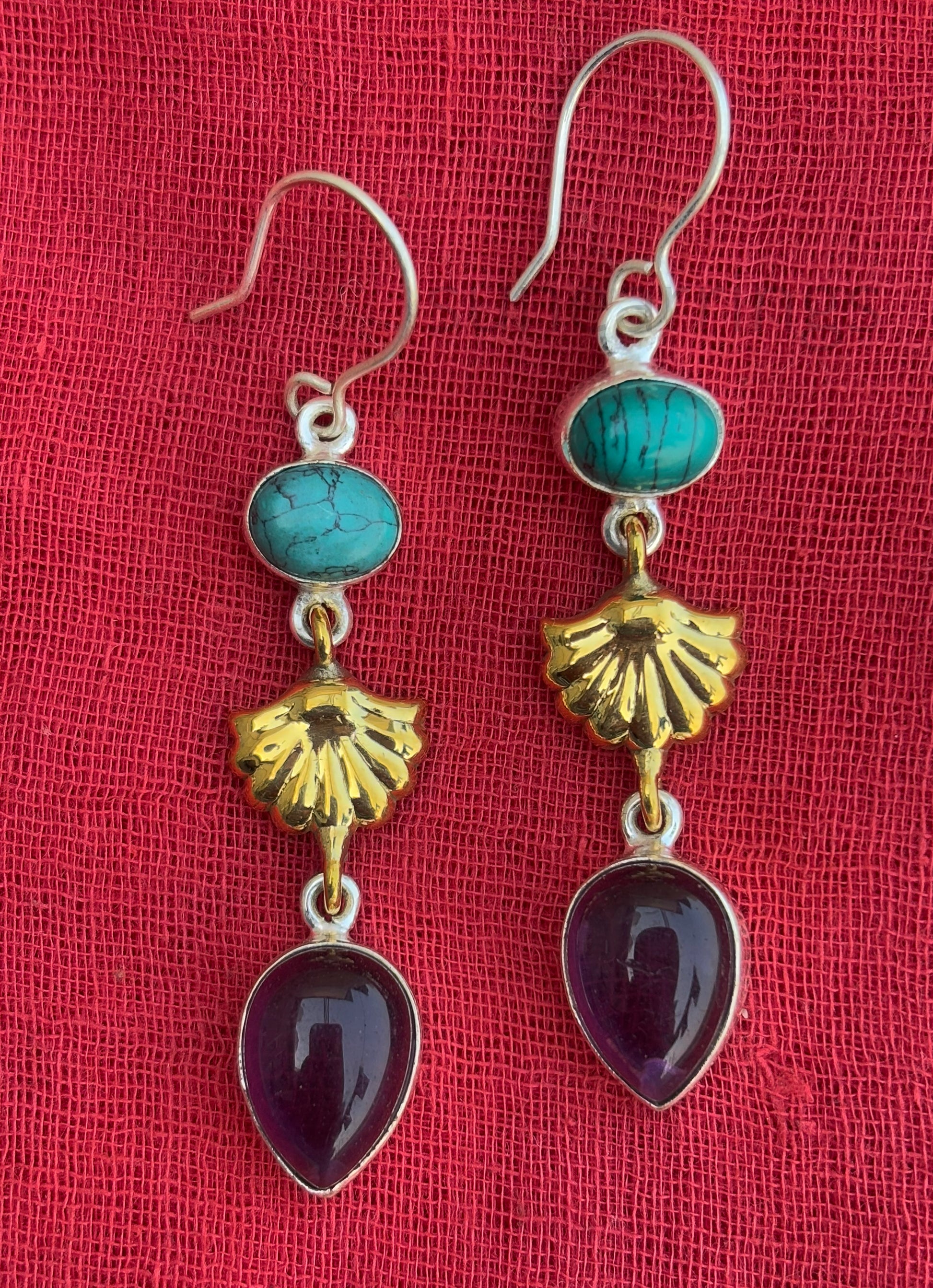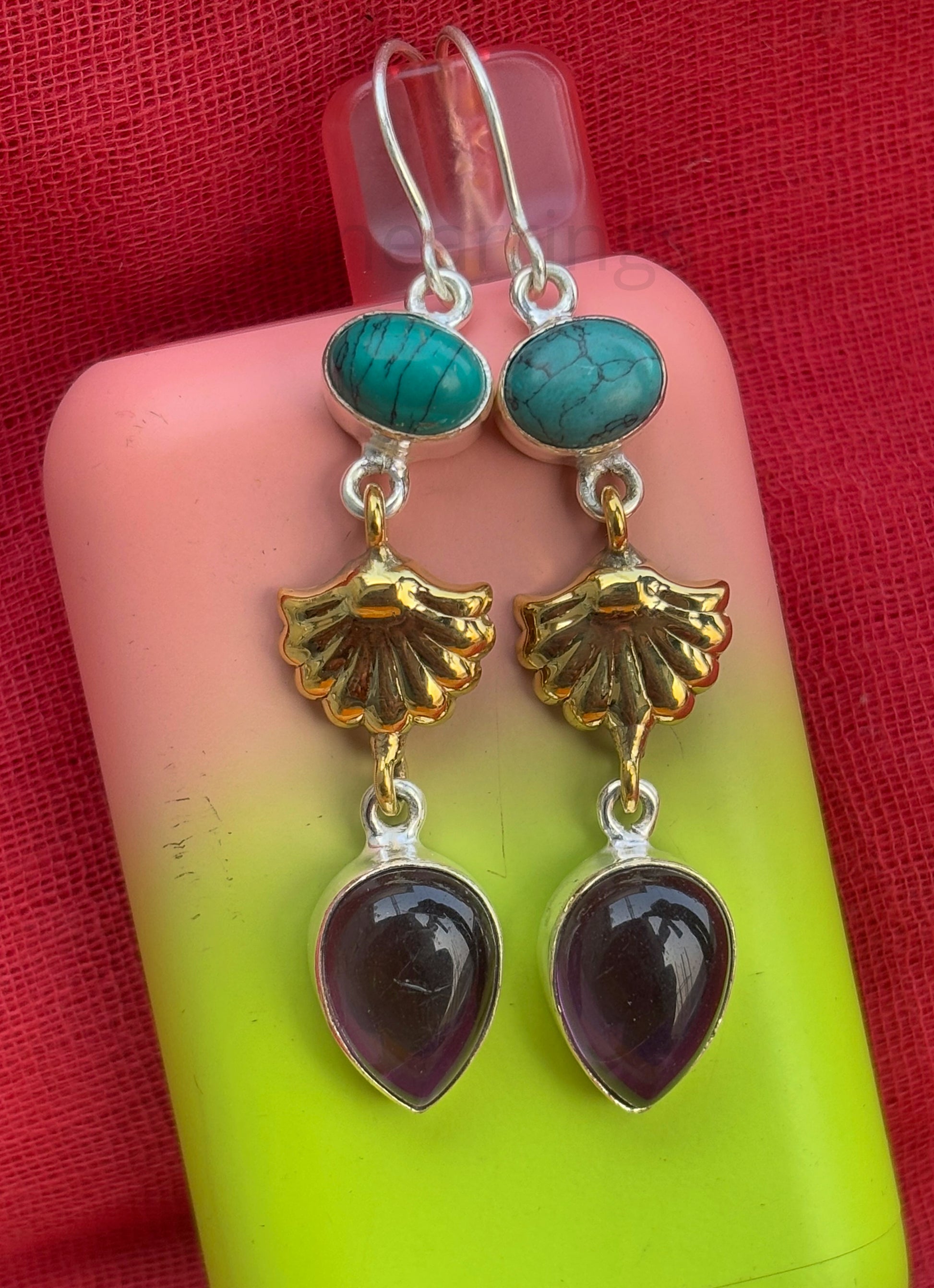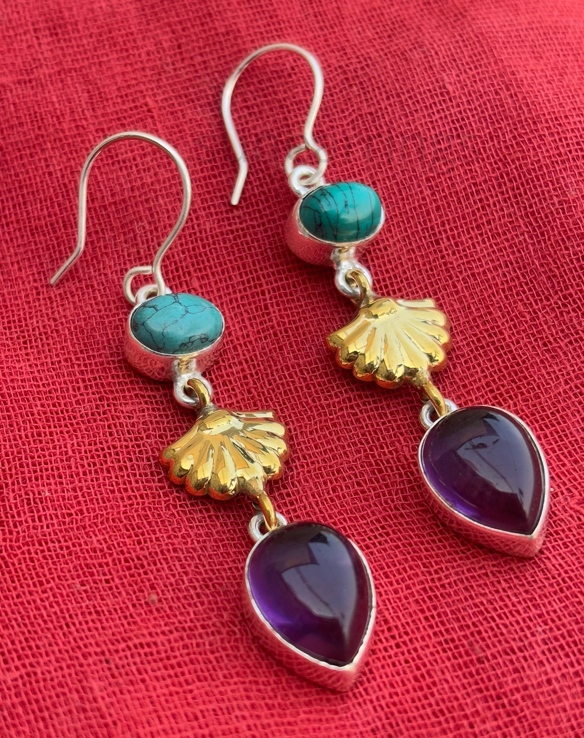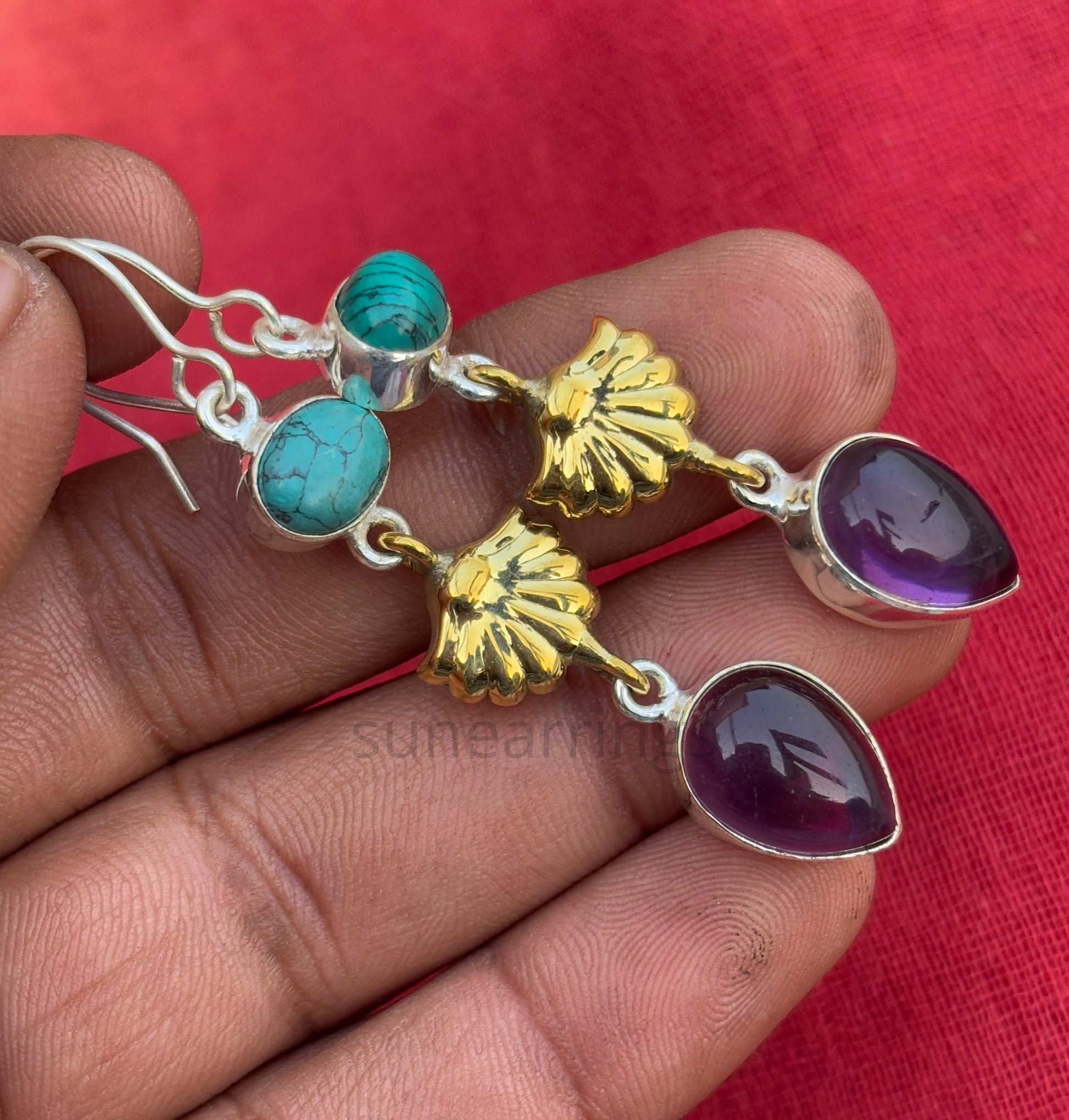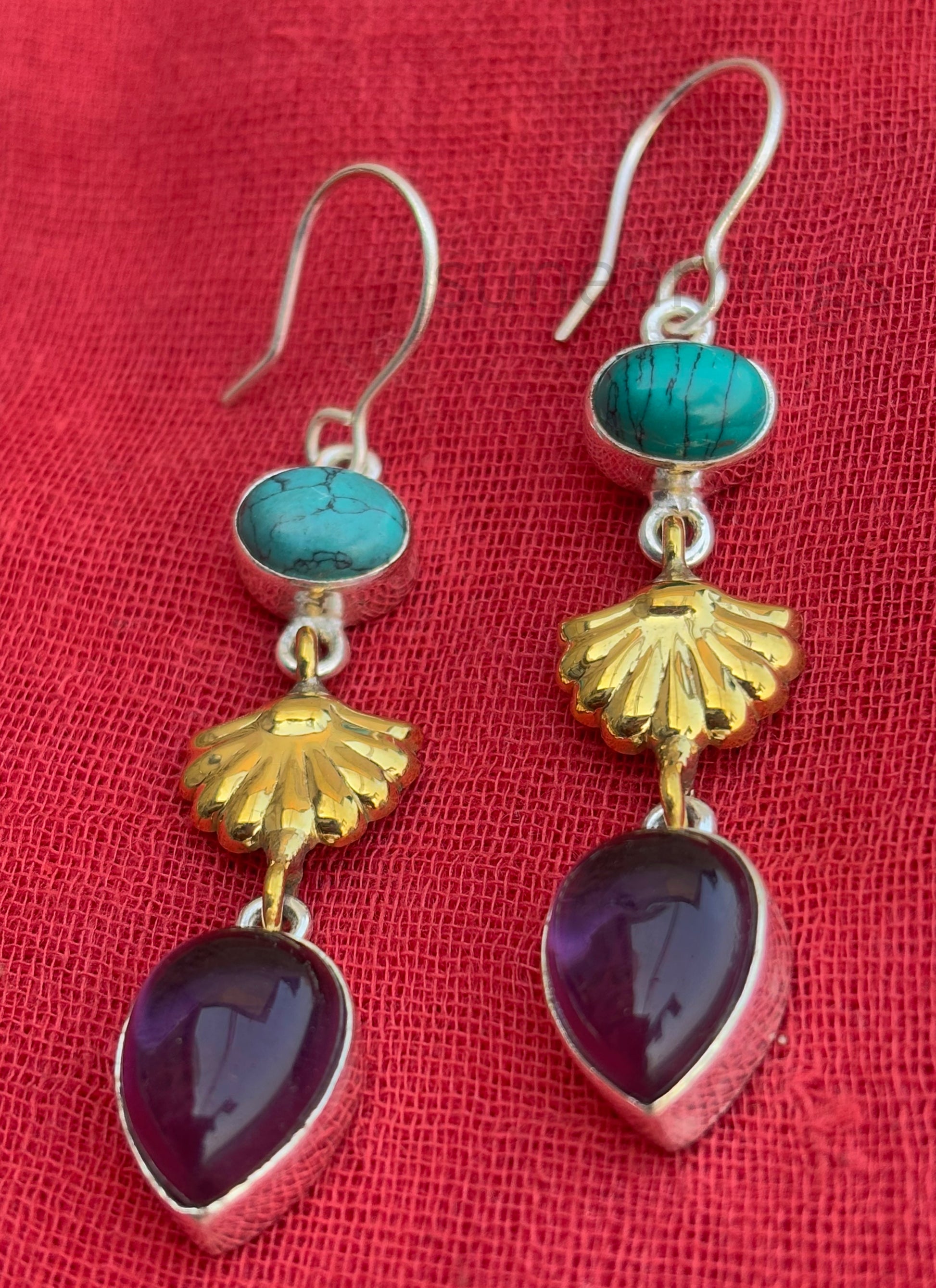 Add a touch of elegance to your look with these stunning handmade dangling drop earrings. Crafted from premium 925 sterling silver and brass, they feature a unique combination of turquoise and amethyst stones, beautifully set in teardrop and oval shapes. Measuring 65mm in length and weighing just 8.5 grams, these lightweight earrings are perfect for everyday wear or special occasions. A timeless accessory for any jewelry collection!